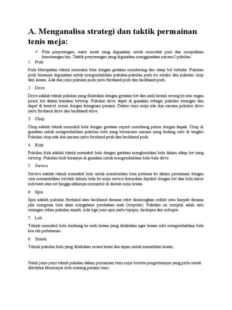 Nah pada kesempatan ini jenis teknik pukulan beserta pengertiannya akan di bahas satu per satu. Teknik memukul bola pingpong yang dilakukan dengan gerakan seperti sedang mendorong dinamakan dengan push. Teknik pukulan yang dilakukan dengan gerakan bet dari bawah serong ke atas dan sikap bet tertutup adalah. Teknik pukulan bola yang dilakukan secara keras dan tajam untuk mematikan lawan. Drive adalah jenis teknik dalam tenis meja yang dilakukan dengan gerakan bet dari arah bawah serong ke atas lengan posisi bet dalam keadaan tertutup. Apr 23, 2021 · salah satunya adalah teknik memukul bola dengan gerakan mendorong dan sikap bet terbuka pada permainan tenis meja yaitu pukulan push. Aug 24, 2020 · teknik memukul bola dengan gerakan mendorong dan sikap bet terbuka adalah a push c block brainly co id. Ada dua jenis pukulan push yaitu forehand push dan backhand push. See full list on blibli.com Gerakan memukul bola dalam permainan tenis meja, dengan gerakan cara mendorong dan sikap bet terbuka adalah pukulan / teknik melakukan (a) push. See full list on blibli.com Jenis pukulan selanjutnya adalah blok. See full list on blibli.com